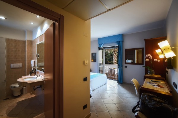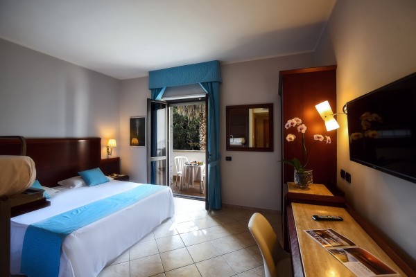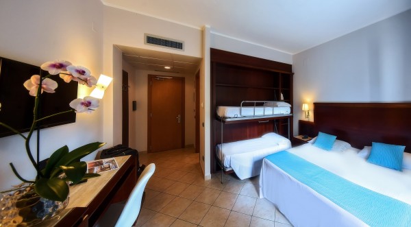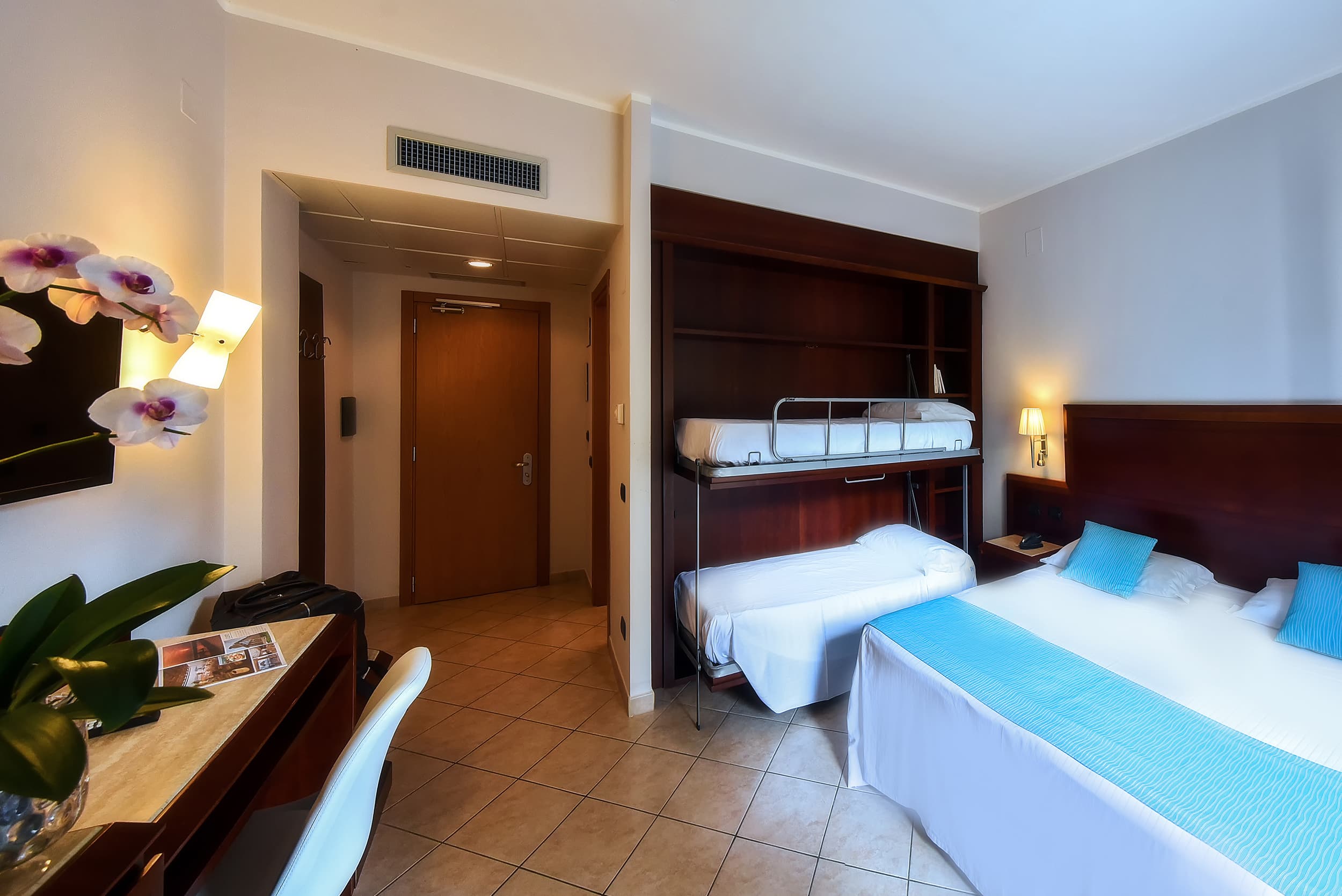 Camera familiare quadrupla, con letto a castello ed ampia circa 26 mq., finemente tinteggiata con colori pastello ed elegantemente arredata.